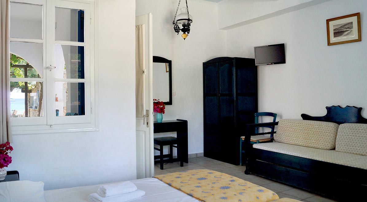 Το δωμάτιο Λαΐς είναι τρίκλινο (2 μονά κρεβάτια και καναπές-κρεβάτι) και βρίσκεται στο ισόγειο. Έχει αυλή με θέα στη θάλασσα.